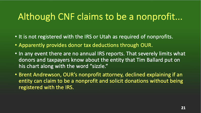 On a website called 'American Crime Journal' I found multiple YouTube presentations from a journalist Lynn Packer relating to Tim Ballard / OUR. (Yes, he's a Mormon). He seems to have done a great deal of research on Tim, his associates, OUR and more. (I am guessing those at ACJ are probably all Mormons too, I haven't checked)