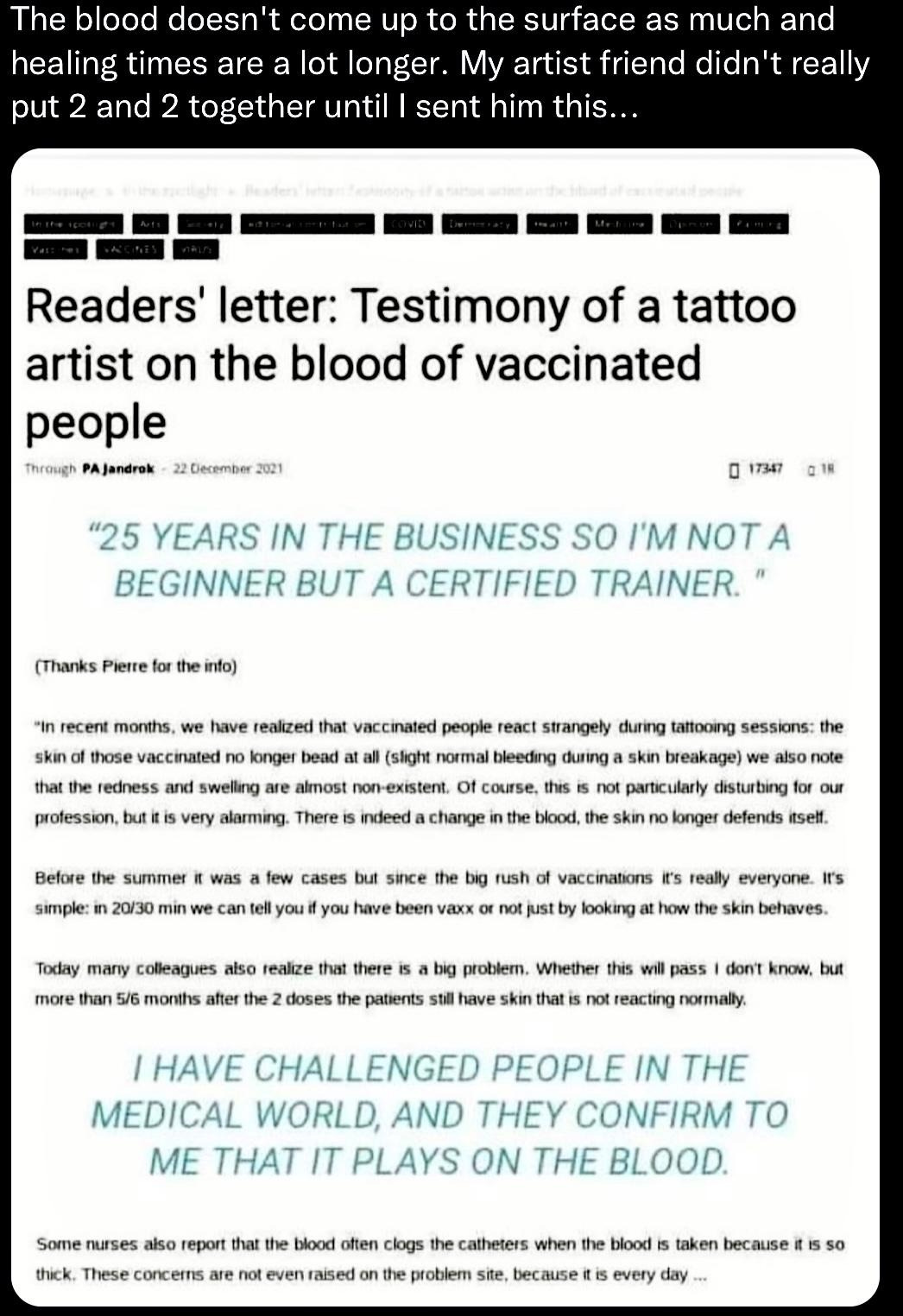 The blood doesn’t return to normal for more than 6 months after vaccination. In just 20 minutes, a good tattoo artist can tell who is vaccinated and who isn’t. I tried reaching out to tattoo artists myself to verify this and they just hung up the phone when I asked about this. I wonder why?​