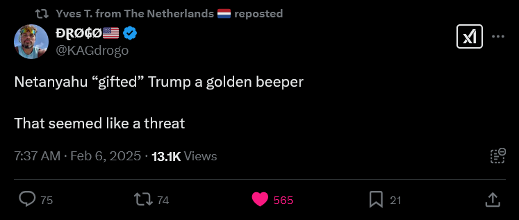 Regarding Trump/Gaza, people seem hyperemotional about whatever Trump says or does. One day is "OMG we are winning, he's the Savior", next day he says something one doesn't like and it's like "he's so awful, how can people support him..." We shouldn't allow ourselves to be thrown around like that I think.