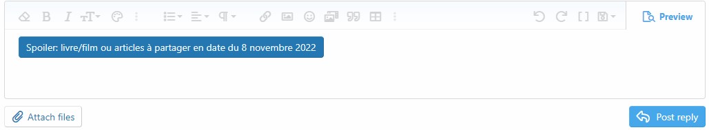 À l’origine, la fonction « Spoiler » sert à masquer du texte afin de ne pas révéler aux autres membres du forum une intrigue ou une histoire sur un livre qu’ils n’ont pas lu ou un film qu’ils n’ont pas vu. Cependant, ceux qui ont lu le livre ou vu le film peuvent cliquer sur le bouton à cet effet et ainsi ils pourront lire ce que nous avions à partager sur cette histoire ou ce film.