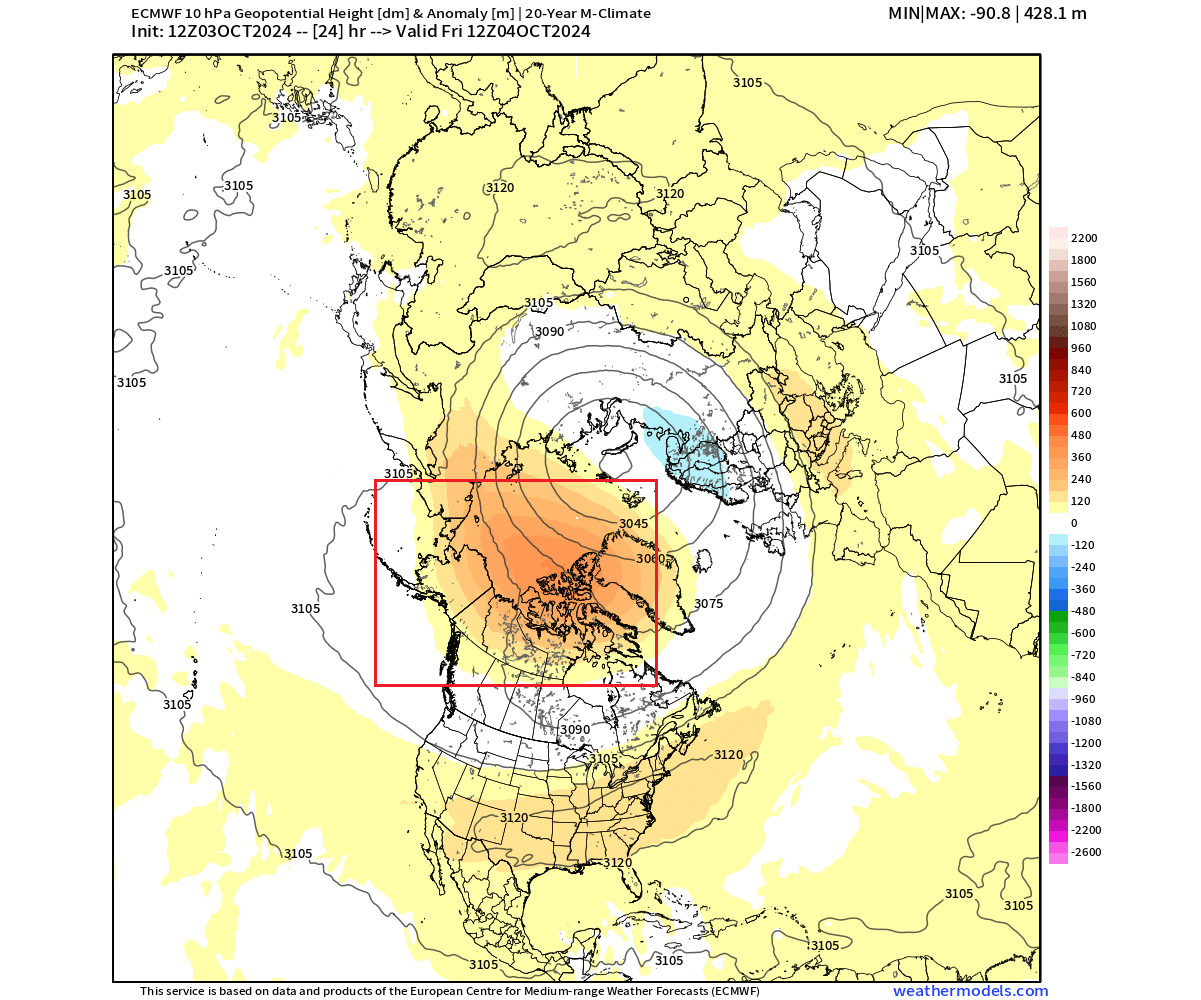 With strong pressure anomalies around the Northern Hemisphere, we are currently observing an unusually weak Polar Vortex in the Stratosphere above the North Pole. This has implications for future weather development and is also connected to how weather patterns will develop over the United States and Canada this month and potentially even in the Winter of 2024/2025.