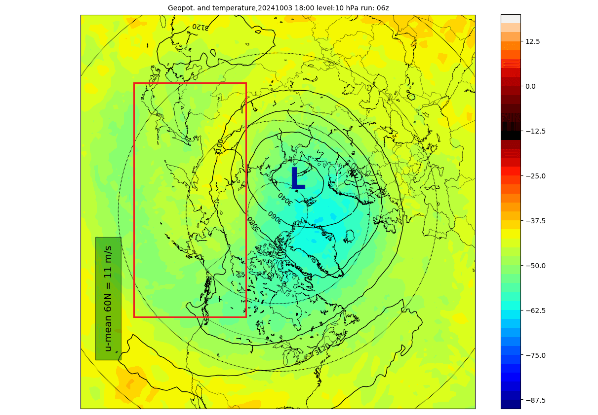If we look at the Polar Vortex forecast on day 10, we can see a strong high-pressure anomaly in the stratosphere still at the western side of the Polar Vortex. But as the vortex still grows in October, it starts to expand. Because the Polar Vortex is growing but is blocked to the west, it starts to create an extension into North America. You can see that, as an arm of the Polar Vortex is extending into North America.