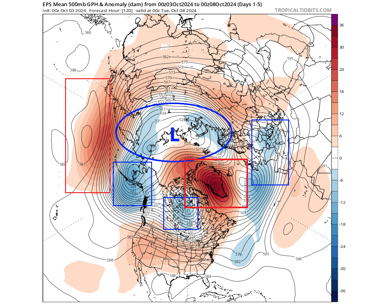 This affects the temperatures around the northern hemisphere. With a weaker low-pressure area over the pole, the colder air is transported out. But since we are just in early October, there is not really any strong mass of cold air available for significant anomalies.