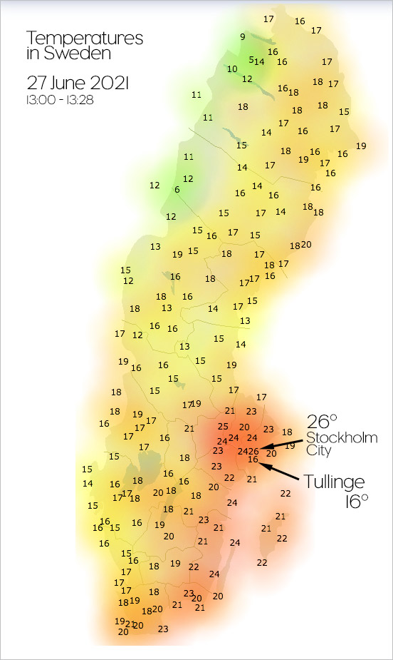 Stockholm resides in an interesting local weather situation today. We are embedded in a sort of warm air pocket, with the highest temperatures (up to 27°C / 80.6°F) of all Sweden.