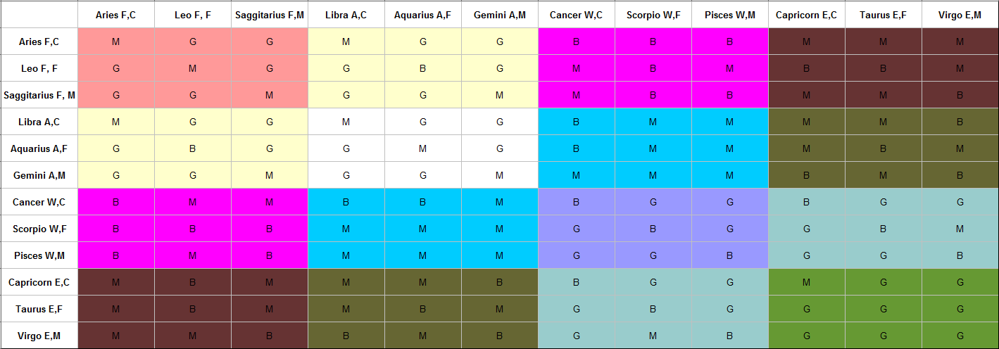 Yes, the chart is like you've said bozadi, arranged first by element, then by modality. "G" stands for "good", "M" for "mixed", "B" for "bad". I was coming at it somewhat more from the perspective of romantic compatibility, but as I didn't think it'd be appropriate to exclude more general compatibility like work/friendship, I made it with that in consideration as well. Some might think of a romantic partner like something greater than a best friend, while others could not be further from such a notion. Where should the line go, if there's to be a line at all? I don't really know. Whatever the case, more specific charts could be made with more specific criteria in mind, but I tried to keep this one as general as possible. I'm a Virgo, if that could be considered a bias (it probably should be). I'm not all too familiar with the workings of this forum yet, but I've attached an image of it to my post, which I hope will turn out OK.
