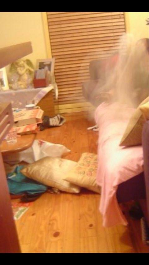Attached is an image taken by a smart phone, the photographer said nothing was there when the pic was taken, the messy room is from the family dogs playing up. This was in her previous house, it followed her to her new home, a near new house that had many of its cupboard doors strapped shut when she inspected it prior to purchasing it.
