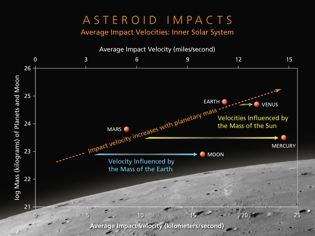This page, Impact Cratering Mechanics has considered the average impact velocities on other planets. First the image for the inner solar system where the Earth is located: