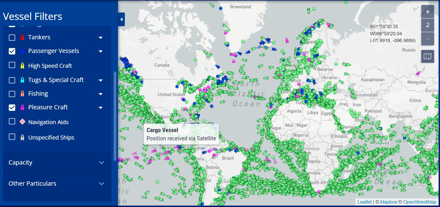 To find out where boats are going, a map like the one from Marinetraffic will do: Below the green are cargo ships, while the blue are passenger ships and the violet are pleasure craft.