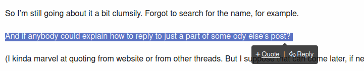 And if anybody could explain how to reply to just a part of some ody else’s post?